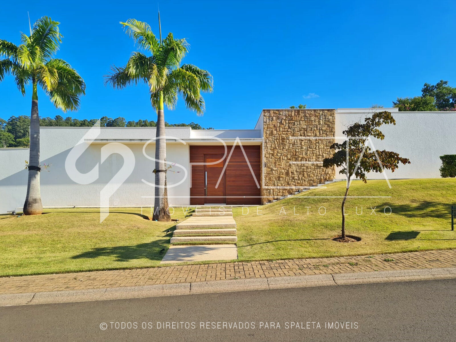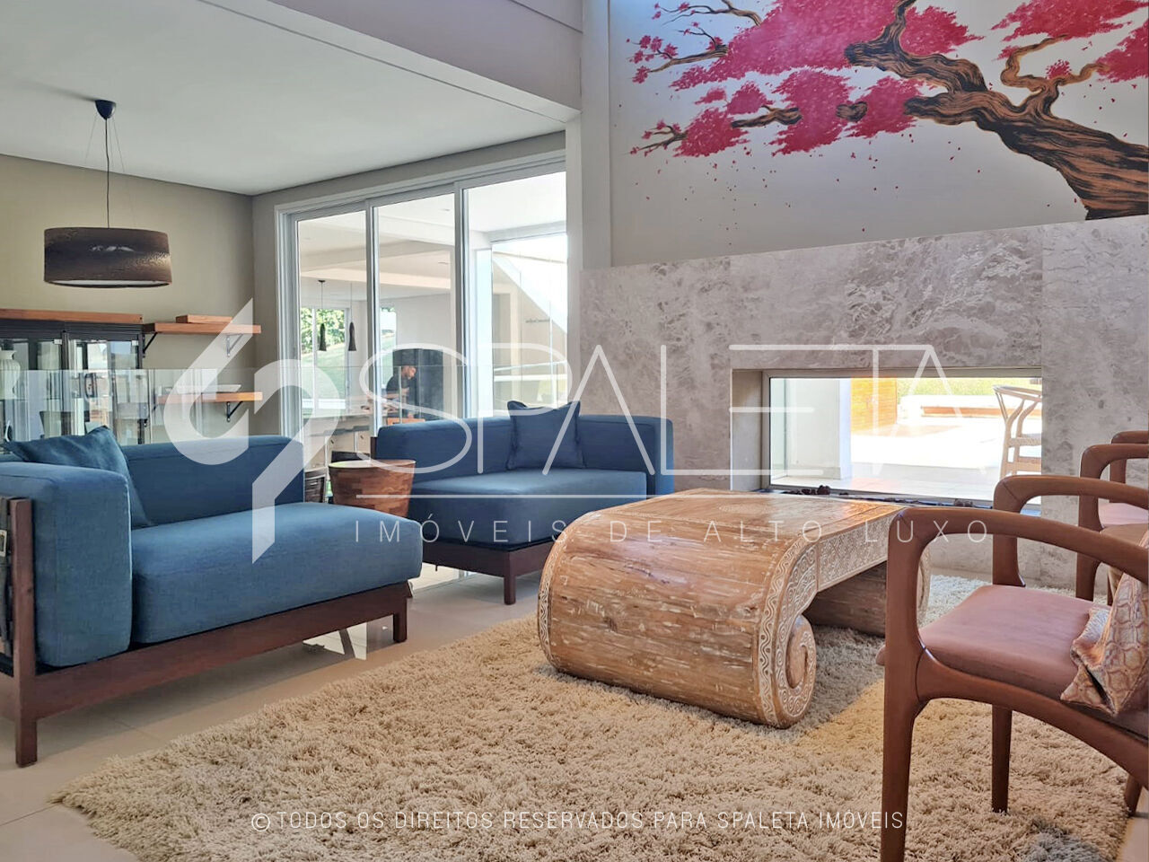 Ela possui um hall social, sala de estar e jantar integradas, home theater e cozinha planejada. No espaço íntimo tem 5 dormitórios, sendo 3 suítes e 2 dormitórios, além de 1 suíte para funcionários.