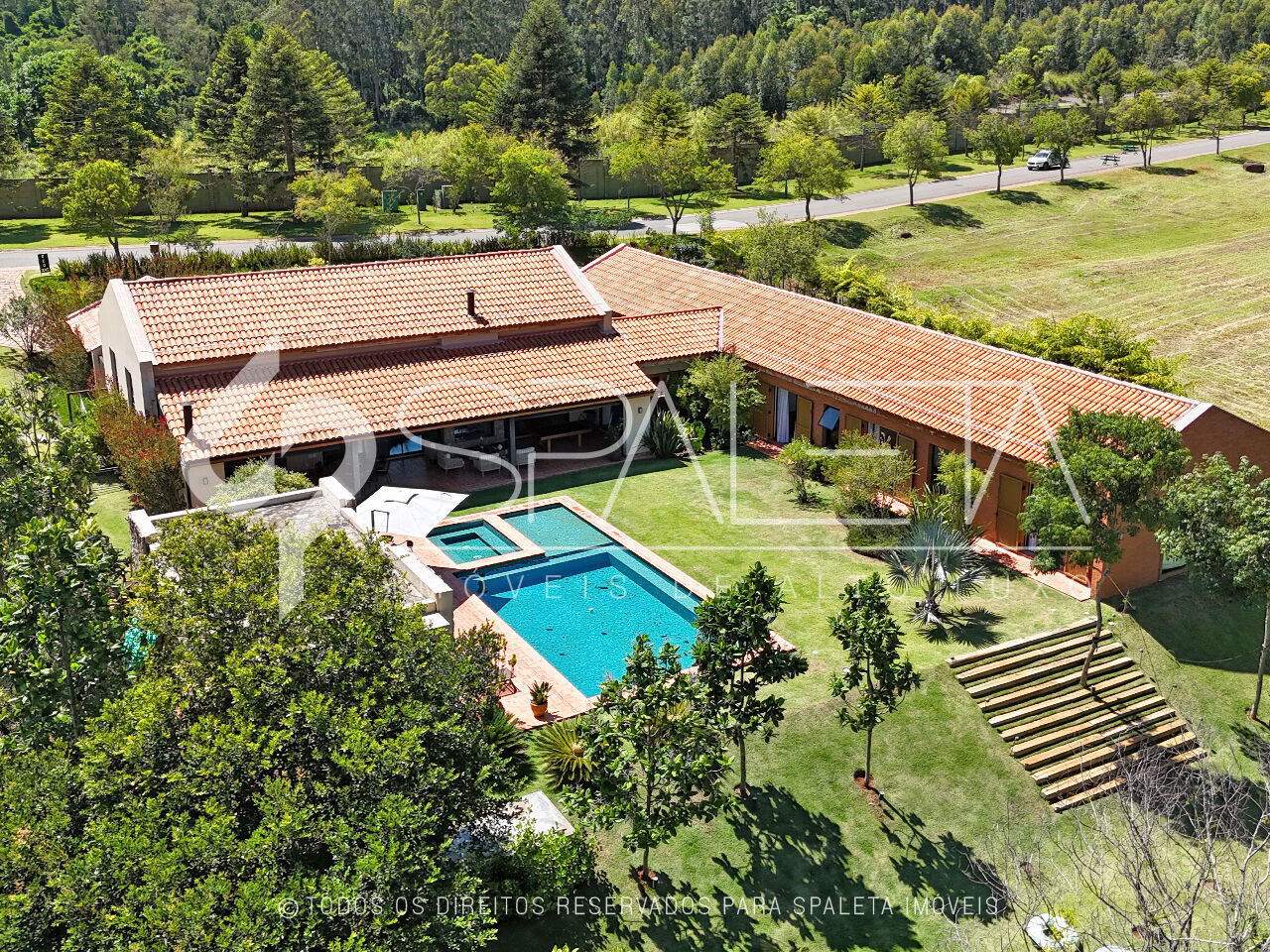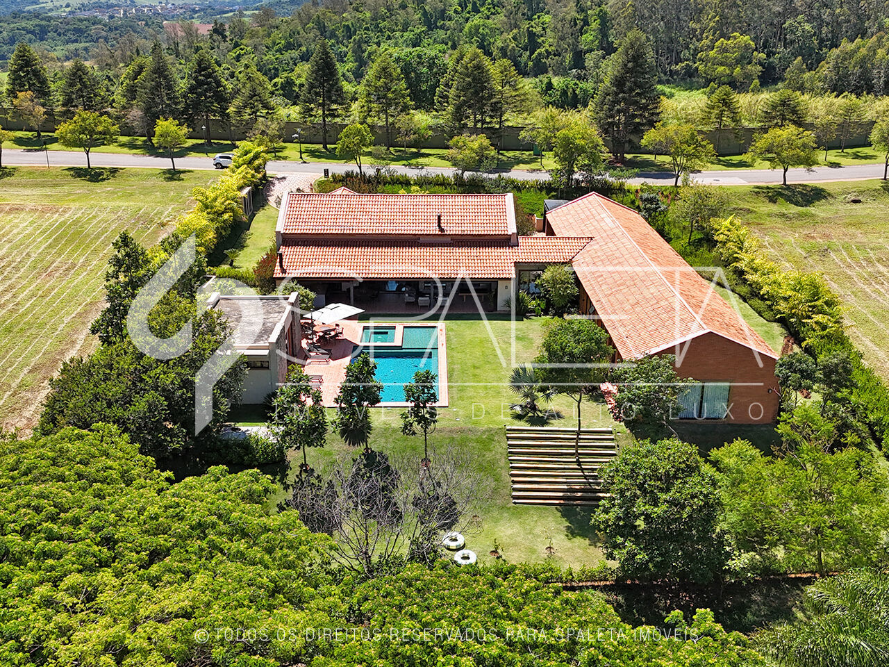 Nos apoios, tudo está resolvido com eficiência: 2 depósitos, garagem coberta, quarto de funcionários com banheiro, horta, iluminação externa, aquecimento a gás e área gourmet equipada com churrasqueira e fogão. Um conjunto que equilibra funcionalidade e vida prática.