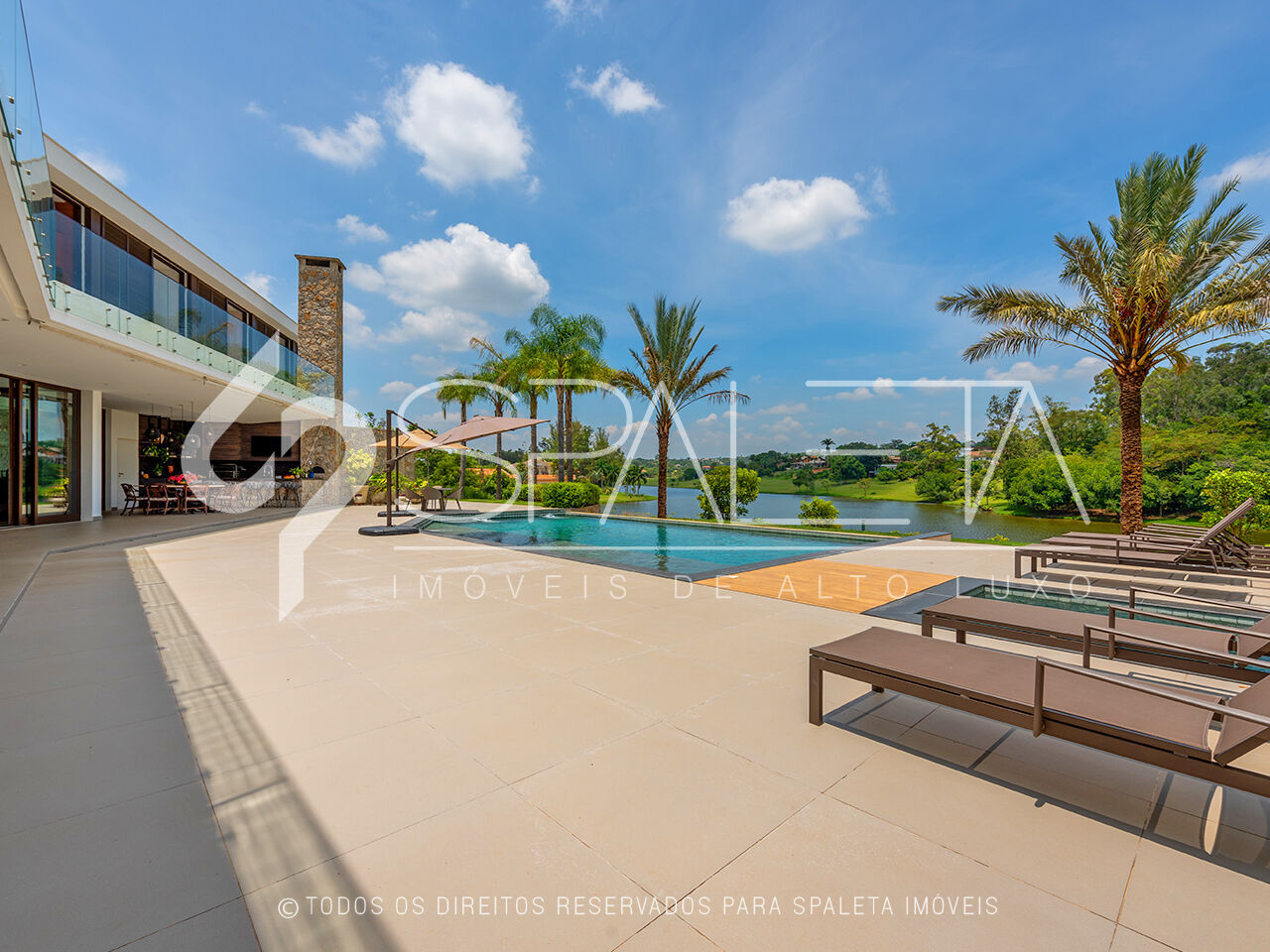 Você será recebido por um living de pé direito duplo com lareira, onde amplas esquadrias revelam uma vista deslumbrante para o lago. O espaço é complementado por salas de TV privativas, lavabo com pedra Ônix que se ilumina e adega climatizada em acrílico com capacidade para 280 garrafas normais e na parede oposta, espaço para garrafas magnum, taças, decanter e charutos, ideal para os apreciadores de vinhos.