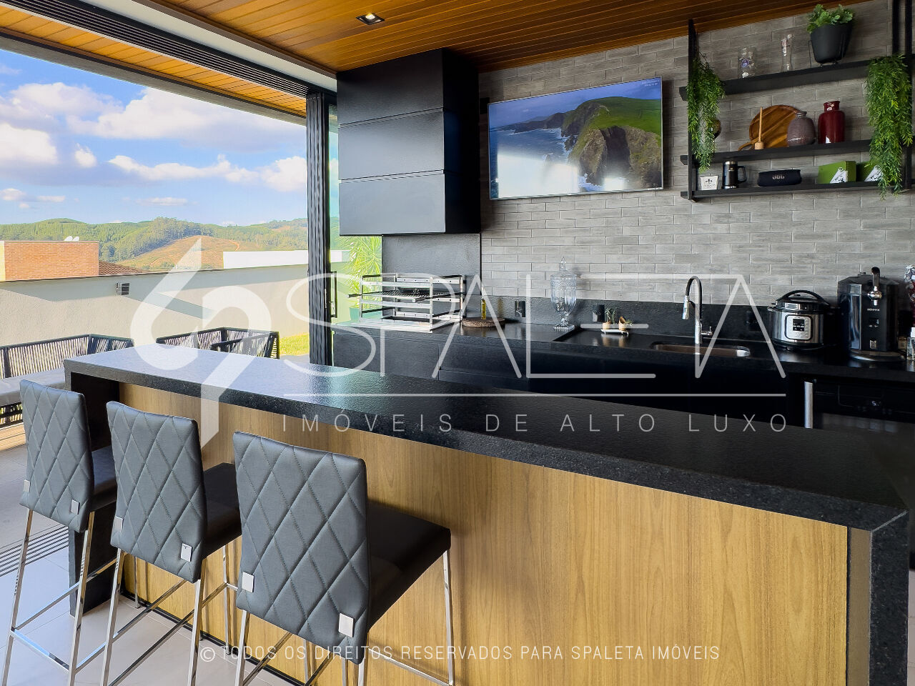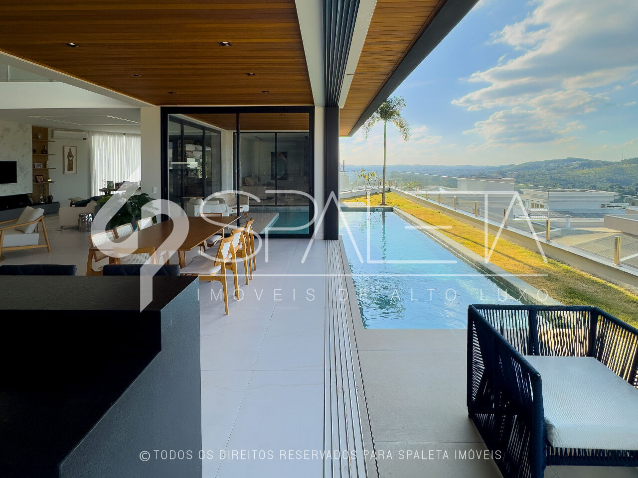 A casa conta com elevador panorâmico em vidro reflecta, sistema de energia fotovoltaica, pressurização e aquecimento solar em todos os ambientes.
